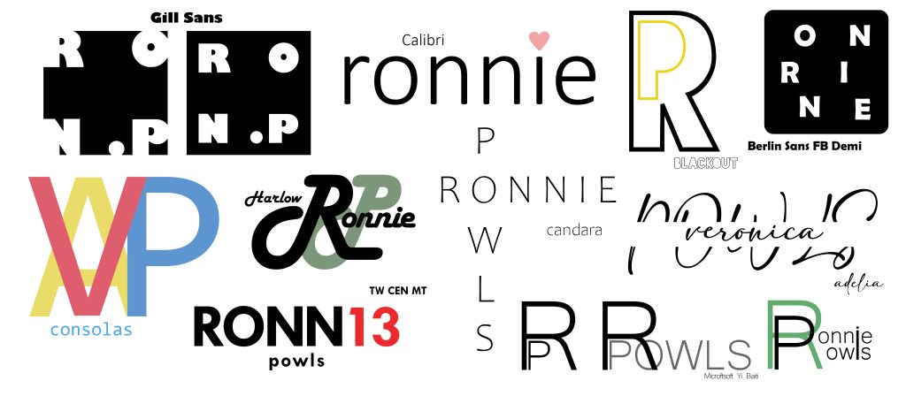 During my initial design stage, I experimented with a variety of colours and fonts, also playing around with different variations of my name. This resulted in thirteen different concepts for my ‘typographical logo’. Despite each font being radically different from one another, I still clearly have a bias, as they are all sans-serif fonts.