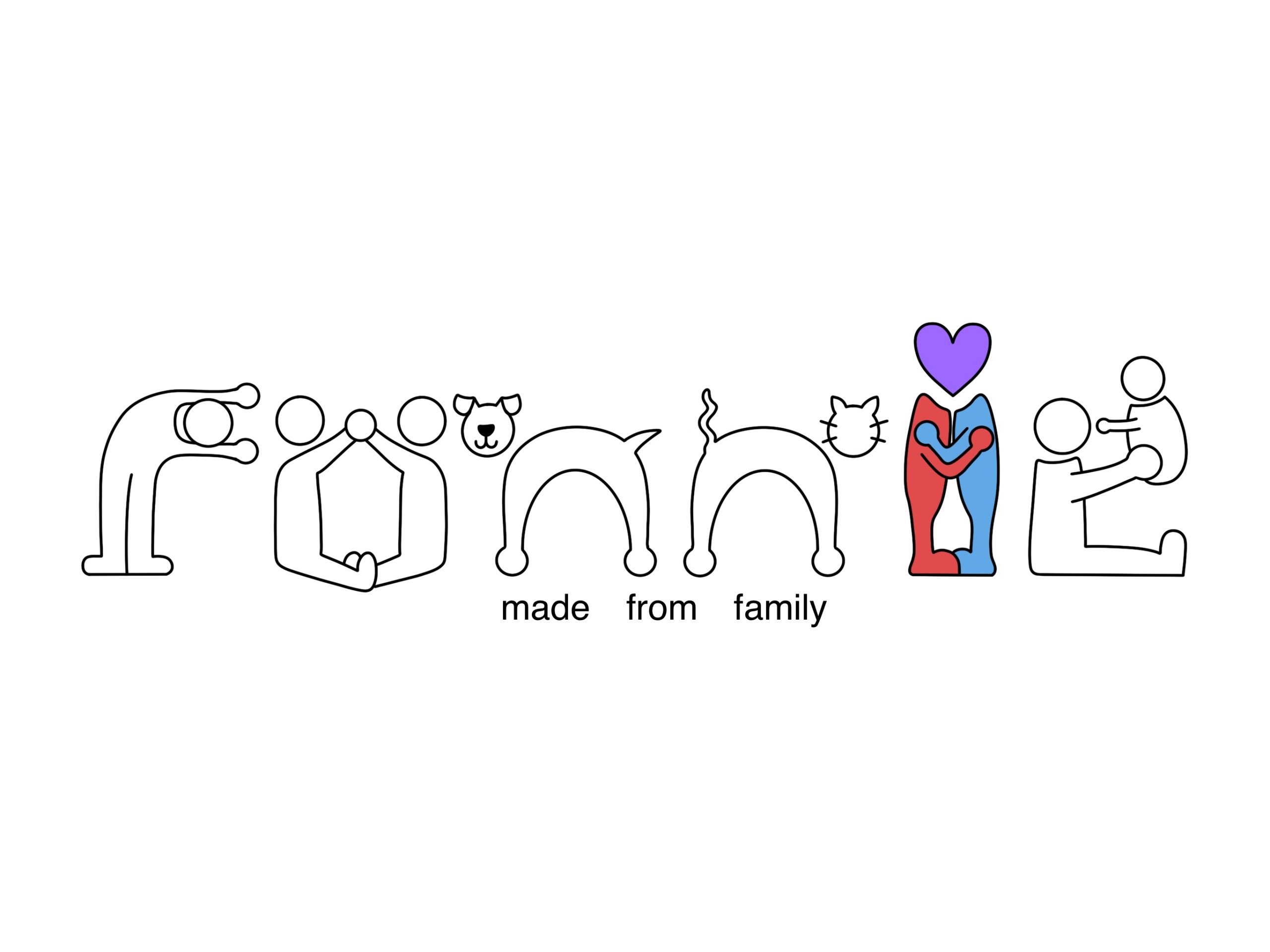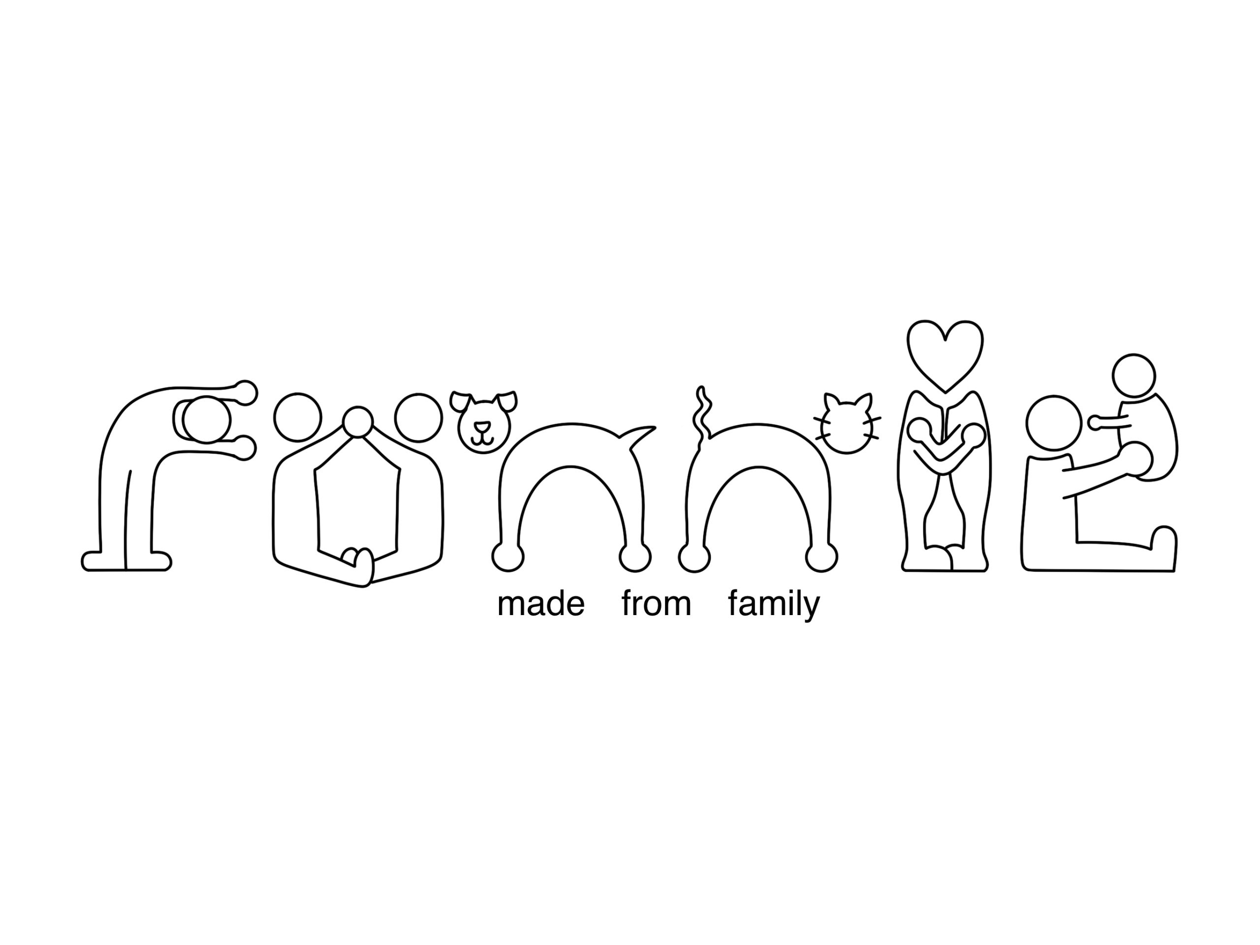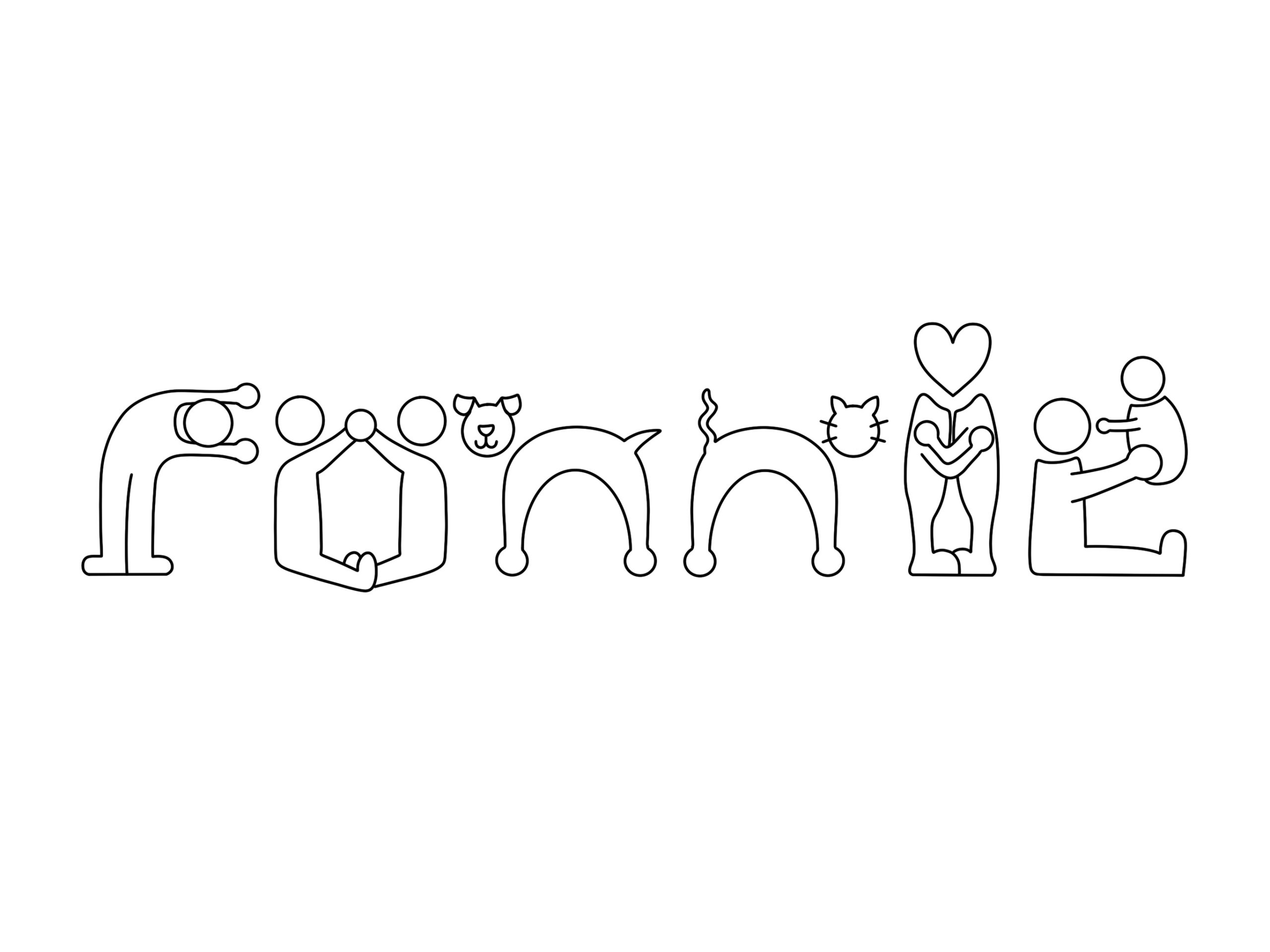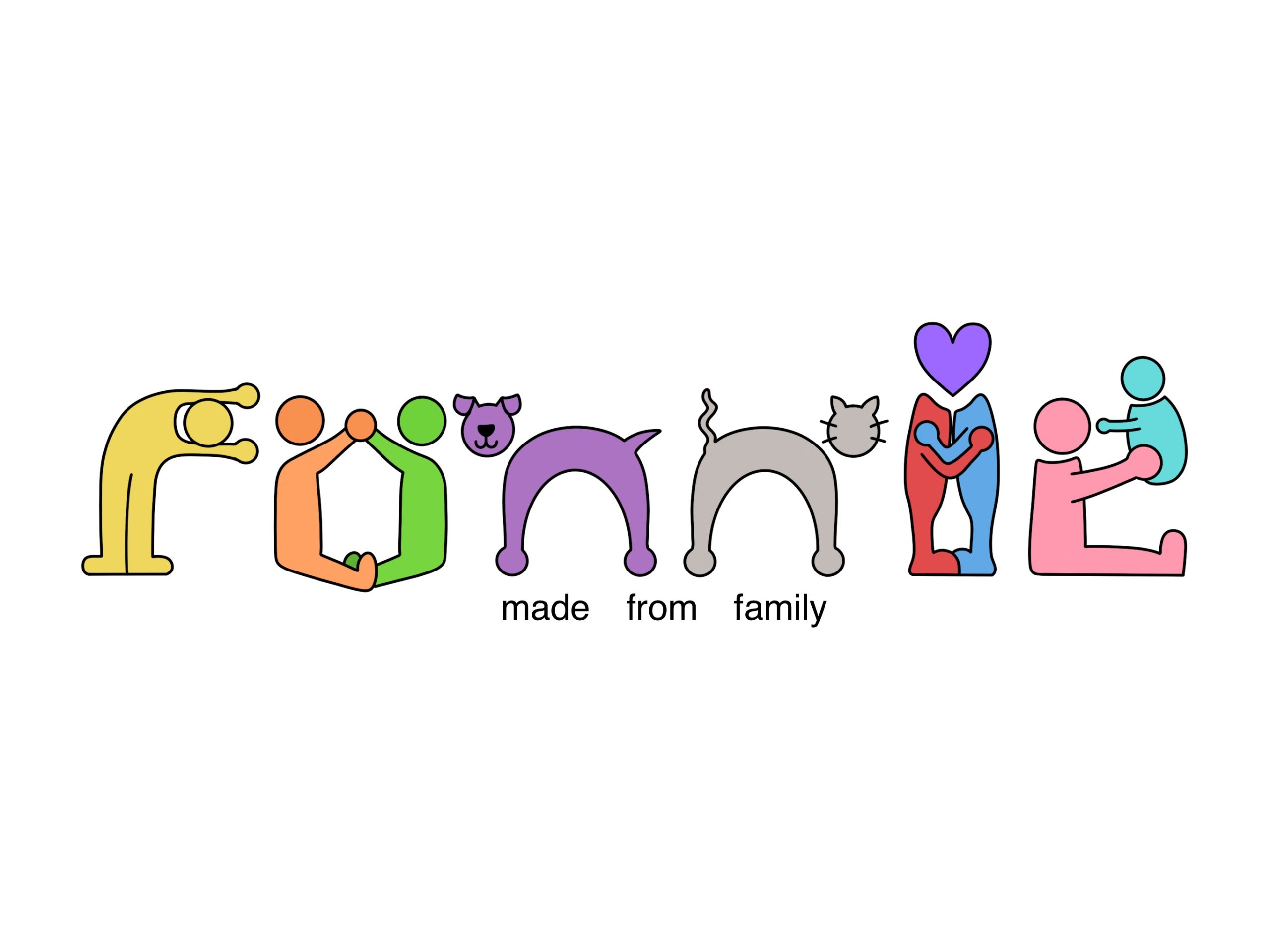 For my second design, I focused on a huge part of what makes me who I am… my family. My initial concept was loosely influenced by the 2009 Change4Life campaign (family-action.org.uk, 2009)1. Beginning with the concept of Play-Doh like men with floating heads in an array of primary and secondary colours. Using a consistent baseline and letter spacing, I began to shape these characters into letters. To incorporate my family into this design, I tried to have each character reflect them. The ‘R’ being my brother, the ‘O’ my parents, both ‘N’s as household pets, the ‘I’ as me and my partner, and finally the ‘E’ as my nanna. Overall, this logo couldn’t be more me, with each element summarizing my core perfectly.