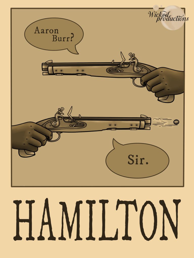 Next came the speech bubbles. After receiving positive feedback on the concept, I still chose to edit one element. Punctuation. In-keeping with the original plot of Hamilton, I chose to pose the top name as a question. Making it as though Hamilton was asking Burr if he was really going to shoot. This was a minor detail that I think received no feedback due to the niche referencing. However, despite not essential, I think adds consideration to the design process.