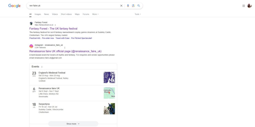 • Google (2025) ren faire uk – Google Search. https://www.google.com/search?q=ren+faire+uk&rlz=1C1CHZL_enGB1000GB1000&oq=ren+faire&gs_lcrp=EgZjaHJvbWUqDAgAECMYJxiABBiKBTIMCAAQIxgnGIAEGIoFMg0IARAuGNQCGLEDGIAEMgoIAhAAGIsDGIAEMgoIAxAAGIsDGIAEMgoIBBAAGIsDGIAEMgYIBRBFGDwyBggGEEUYPDIGCAcQRRg80gEIMTQ5M2oxajSoAgCwAgE&sourceid=chrome&ie=UTF-8 [Accessed 15 Mar 2025]