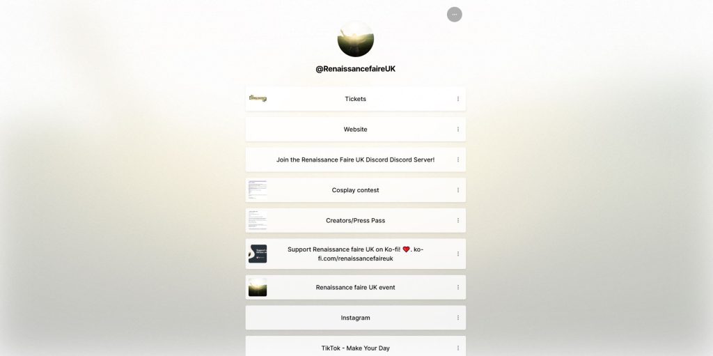 • RenaissancefaireUK (2025) RenaissancefaireUK | Instagram, Facebook, TikTok | Linktree. https://linktr.ee/RenaissancefaireUK?fbclid=PAZXh0bgNhZW0CMTEAAabiH54btZN3RVEJoAeCwwweWMP29fKTTaPLxUflyfqDMZ9g2OOGYeIJtVA_aem_-ZyrozHvNW7dV2AkL9ZpaA [Accessed 15 Mar 2025]