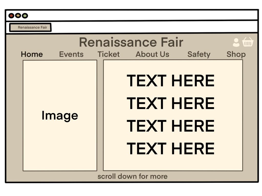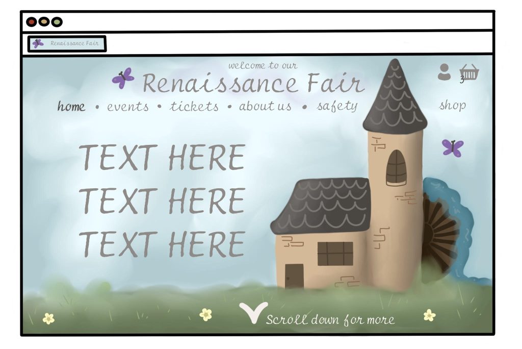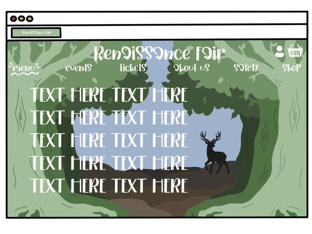 For my first rendition, I wanted to focus on the most minimal approach, creating a clean and relatively simple layout. Whilst the design was easy to navigate, nothing about the concept screamed ‘Ren Fair’. If I had chosen to go forward with this prototype, there are elements I feel I would need to address. Primarily the font and colour choice, as the page as a whole reads like a sad dated newspaper. I think with a brighter colour pallet and the correct typeface, this prototype would have been a more viable option.