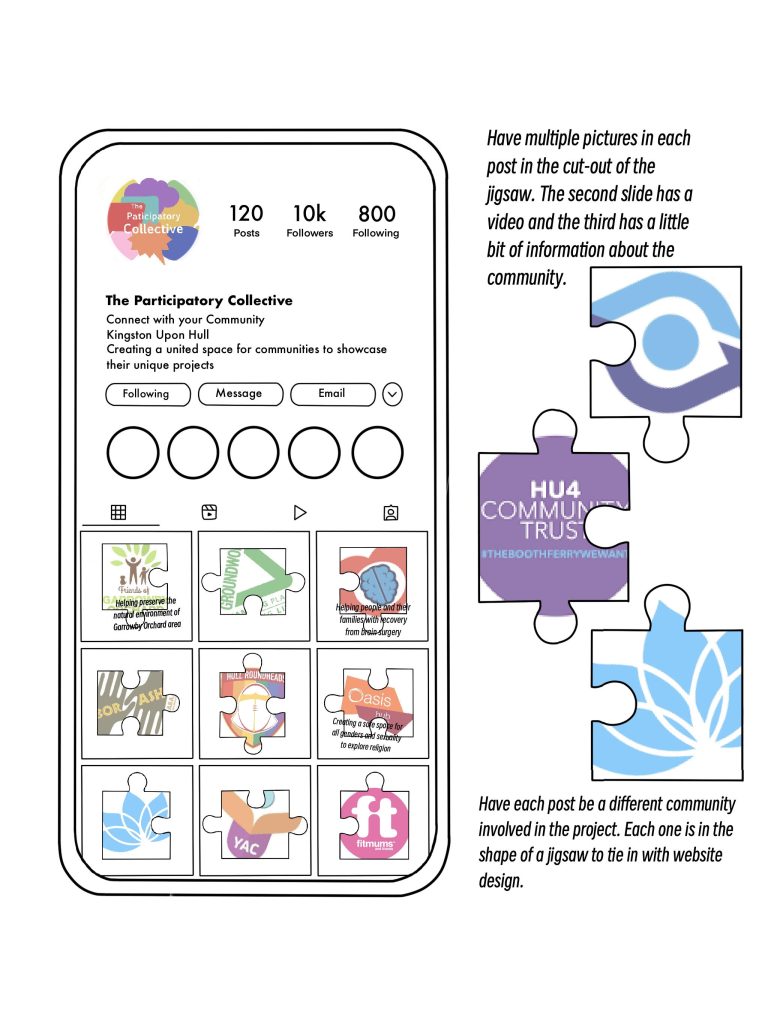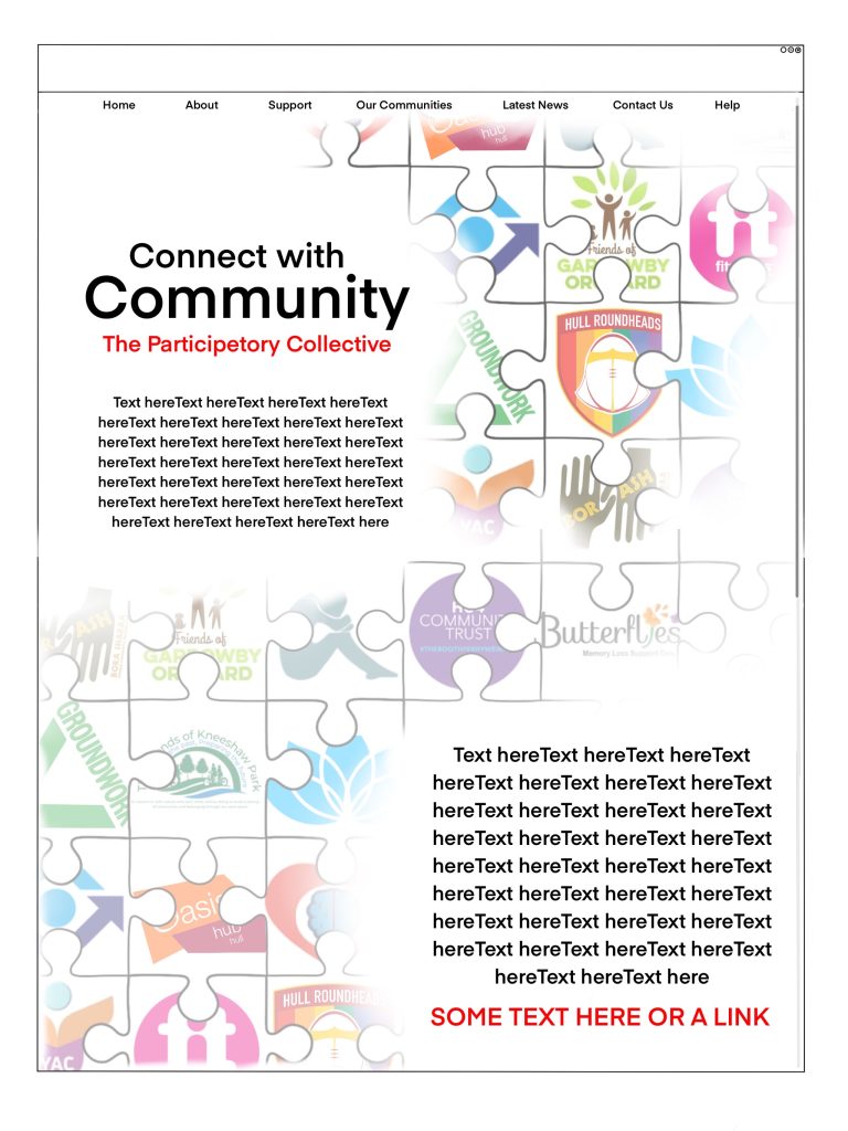 With all of this information to help guide me, I started designing my website concepts. Similar to my logos, I felt multiple iterations was the best way to go, resulting in three proposals. Two of these designs grew from one another, with large themes of jigsaws to help display pieces connecting. The first, was an elaborate page showing all sixteen groups as puzzle piece. My main concept for this piece, was to make the site as interactive as possible. This would be achieved through small videos of each community playing when the user hovered over the logos, which could then be clicked on to explore the individual projects further. The second was a much more simplified construct of this. Whereas the previous design was aimed to be interactive, this format was much more text oriented. Whilst I liked the striking nature of this design, the eco-footprint was too large, as each image required excess energy to display. The final was very opposed to the previous two, with the main concept being a map of Kingston Upon Hull. The idea was to create a real sized map showing each communities location in Hull. Whilst this concept was my great in theory, I found that the communities were too spread out. If I’d have moved forward with the design the text size would have been greatly diminished, impacting a large percentage of my target audience.