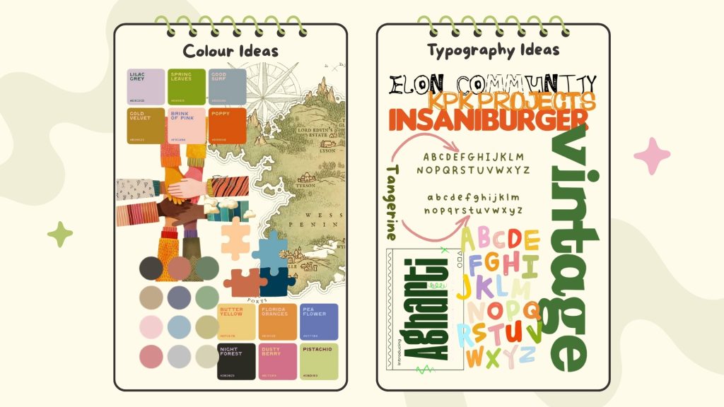 At this stage, I had multiple ideas ruminating so it was difficult to narrow down my mood boards. Instead, I chose to leave the door open to multiple possibilities, and included several concepts, from hands together to local maps. I found that visuals also helped express the implications of my colours. Much like the illustrations demonstrated to us by Gill and Kate, I felt it was important to stray away from more common ‘community project’ designs. By using rich greens, oranges and blues, I hope to encapsulate a grown up concept of youthfulness.