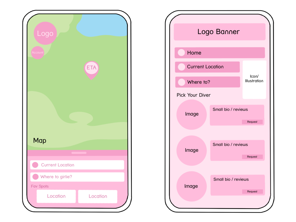 Due to these results, I had a clear structure I knew I wanted to move forward with (design one). From here, it became all about creating the identity of my app, alongside heightening my design laws. By adjusting the position of the logo and tweaking the colour palette to be as legible as possible, I was able to solidify my use of ‘Miller’s Law’ (E. Stevens, 2024). Then, through the addition of relevant icons, my users persona began to shine through. All accumulating to demonstrate a clear call-to-action, which aligned with my companies agenda… to help women feel comfortable in a taxi again.