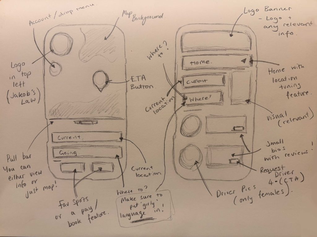 The first step towards this, was through quick pencil wireframes, which I then developed into digital renditions for clarity. By creating these four rough wireframe sketches, I was able to start deciding which key design laws I wanted to focus on throughout my app. Looking back at my competitors, I noticed that almost every app instilled a mixture of ‘Jakob’s Law’, ‘Laws of Similarity’ and the ‘Aesthetic-Usability Effect’ (E. Stevens, 2024). So, that’s were I started. This meant, for most, a map on the top, information underneath and a pay/book feature along the bottom. Whilst these were tried and tested methods for most taxi apps, I wanted to shift my attention onto different designs laws, to help my brand stand out.