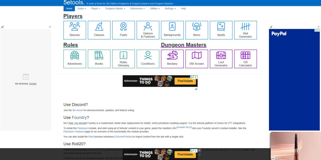 Going into this stage of the project, it was hard for me to grasp how to design things like banners. In the modern era of premium subscriptions and ad-blockers, younger generations are far less likely to engage with advertisements (M. Feeley, 2025). Because of this, I was left relatively stumped on what visuals and messages would translate well into my designs. In order to combat my ignorance, I searched for different sites that used excessive adverts, to see just what stuff I was competing with. The main one I landed on, was a D&D companion site called 5etools (5etools, 2025). This page showcased several different advertising shapes and sizes alongside placement options, giving me a much clearer image of the scaling varieties of my information.